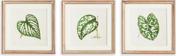 This set of petite prints is a traditional subject with an unexpected perspective. All the character and natural beauty in these variegated leaves is front & center in these fresh compositions. Finished with a white mat and whitewashed wood frame a handsome set for study, bookshelves or powder room.