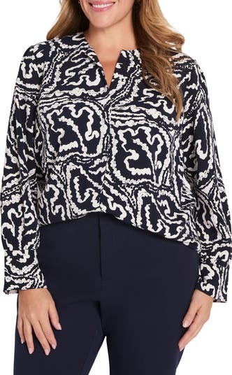 A leaf print covers this polished crepe top that's perfect for work or play with its split neckline and flared-cuff long sleeves.