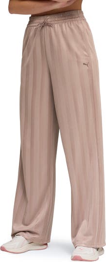 Subtle stripes detail wide-leg sweatpants designed with an adjustable drawstring at the waist for comfort while running errands and at the gym.