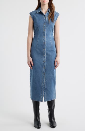 Crisp tailoring defines this cotton-blend denim midi shirtdress styled with a button-front placket and structured silhouette for work-to-weekend polish.
