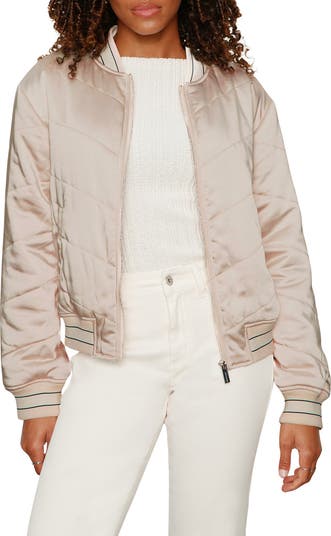 Dropped shoulders enhance the relaxed fit of this satin bomber made with puffed quilting and anchored by striped ribbed trim.