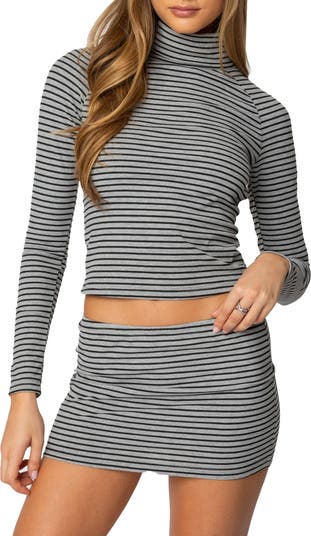 This cozy turtleneck top covered in smart stripes is knit in a cropped silhouette with a flirty back cutout that makes it perfect for a night-out look.