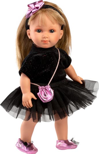 This beautifully detailed doll is ready to see a show in a sparkly black sweater and tutu skirt accented with metallic shoes, a headband and coordinating purse. Made with moveable joints, this doll encourages children as they develop their nurturing and self-help skills.