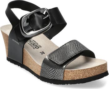 A chunky statement buckle secures the quarter strap of this comfort-focused sandal elevated by a cork-cushioned platform wedge and shock-absorbing sole.