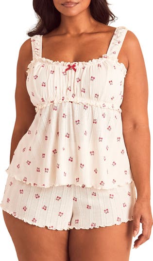 This knit tank and short PJ set features a built-in mesh shelf bra, soft ruching at the bust and straps, and matching shorts with an elasticated waistband.