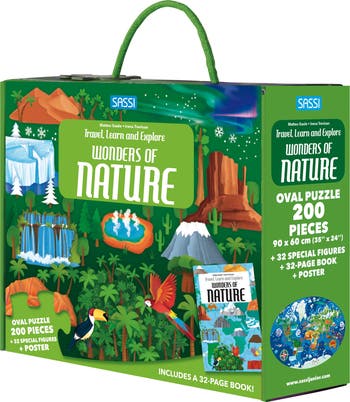 • INTERACTIVE PUZZLE EXPERIENCE: Features a large oval (35.4 x 23.6") 200-piece puzzle that allows children to piece together a map of the world and engage with 32 shaped figures representing different natural wonders.