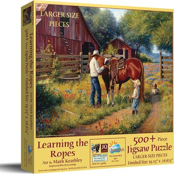 Discover the joy of puzzle solving with "Learning the Ropes," a 500-piece oversized masterpiece by SunsOut Inc. and renowned artist, Mark Keathley. Perfect for adults and proudly made in the USA, this vibrant jigsaw puzzle immerses you in an enchanting rural scene. The thrill of assembly is combined with stunning artistry, detailed countryside imagery, and captivating dimensions of 19.25" x 26.625", creating an unforgettable, immersive experience. Constructed using high-quality, durable, and sustainably sourced recycled cardboard, each piece of the puzzle fits seamlessly, giving both seasoned and beginner puzzle enthusiasts an enjoyable, frustration-free experience. Its manufacturing embraces SunsOut's commitment to environmental responsibility as it uses soy-based inks and recycled materials. Additionally, SunsOut offers a worry-free guarantee with a dedicated customer service team for any issues regarding missing or damaged pieces. Ideal for holiday gatherings, family fun, or solitary relaxation, "Learning the Ropes" is more than just a puzzle—it's a timeless journey into the heart of rural life, an enriching challenge that holds the promise of creating cherished memories.