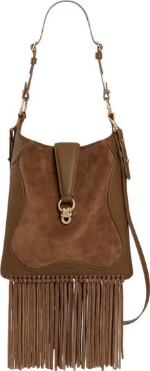 Fringed leather and suede bag with a signature magnetic clasp, for carrying on the shoulder or across the body.
