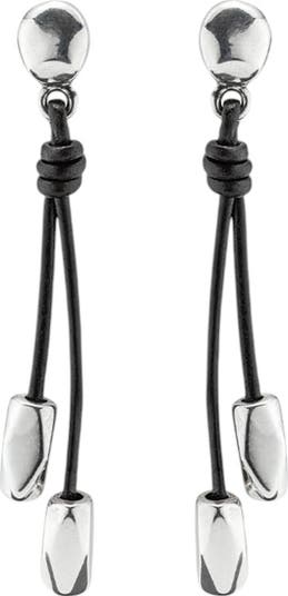 Elongated sterling silver-plated wires carry a sequence of polished beads, creating a refined line that sways with movement.