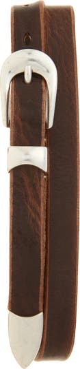 Crafted from premium Italian calf leather, this slim belt showcases a rugged finish complemented by gleaming metal hardware.