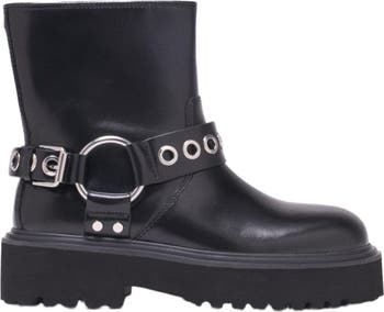 This biker boot offers a new take on the rebellious look, blending structure, metallic details and premium leather.Its chunky silhouette and tread sole contrast with the shiny leather and the powerful silver-tone ring harness, creating an assertive, practical piece that's full of attitude. Pair it with a short rib knit skirt and a mini Miss M for a sharp, modern look.