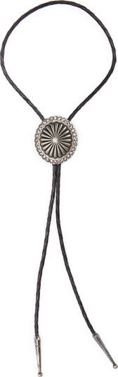 An ornately carved concho in a sunray motif secures secures a rugged braided-leather bolo tie with a touch of Southwestern flair.