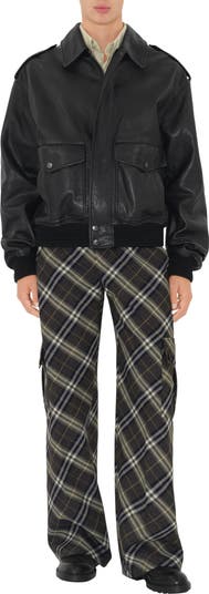 A bomber jacket made in Italy from supple calf leather, tumbled for a softer finish. Cut to a relaxed fit, the design features press-stud epaulettes and is jacquard-knitted with our logo at the hem.||Press-stud and two-way zip closure|Press-stud flap pockets|Rib-knit trims|Equestrian Knight Design lining|Knitted Burberry lettering at hem|Comes with a garment bag