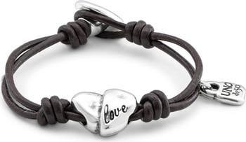 Adjustable brown leather bracelet with an irregular silver-plated heart-shaped central piece.