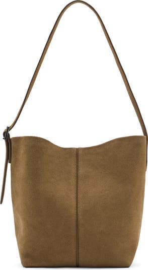 A geometric buckle adjusts at the shoulder strap to provide comfortable wear on a spacious bucket bag shaped from soft suede.