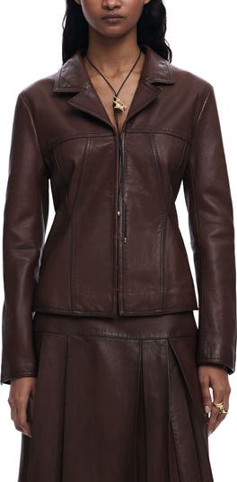 Elevate your ensemble in this rich leather jacket made in a tailored silhouette and framed by split cuffs.