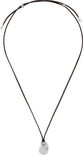 A hammered pendant and leather cord make this necklace an earthy yet sophisticated addition to your look.