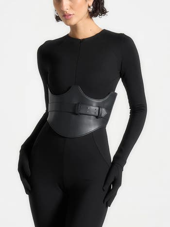 This Vegan Leather Corset Belt features a striking belt detail and a sophisticated dipped hem design. Made from high-quality vegan leather, it enhances any outfit with its sleek, modern style. Elevate your look with this cutting-edge accessory.
