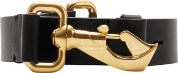 A belt made in Italy from smooth calf leather. Inspired by elements from our Equestrian Knight Design, the horse clip fastens to a shield-shaped hoop.||Hand-painted edges|Engraved Burberry lettering at closure|Comes with a dust bag