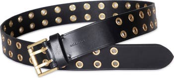 Brushed eyelets bring a bold and edgy aesthetic to a rich leather belt featuring signature logo debossing and a buckle that adjusts for a comfortable fit.