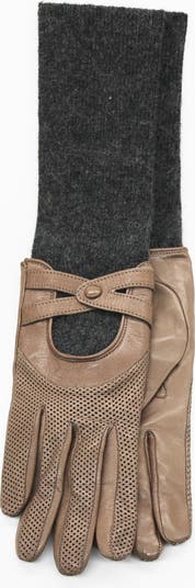 Short leather gloves with top in perforated leather, opening and belt with button in solid leather with a 9.5" long ribbed knit cuff