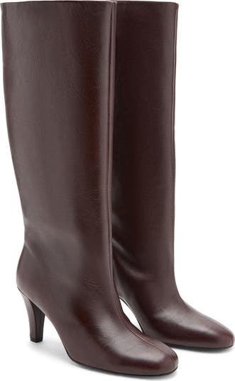 Polished bovine leather lends a refined look to this sleek knee-high boot styled with a smooth round toe and set on a subtly tapered heel.