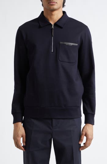 Built around restraint and impeccable finishing, this cotton-blend pullover keeps the profile clean while the fabric delivers soft, midweight comfort with a substantial feel. The quarter-zip placket is set with tidy precision and engraved leather accents elevate the minimal design with depth, touch and a sense of heritage craft.