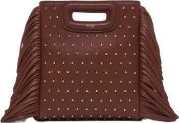 Maje's iconic M bag comes in a mini version in smooth leather accentuated with studs, a chic detail inspired by retro style. Featuring fringe detailing on the sides and a sheathed handle, it has an embossed gold-tone logo and a signature engraved on the buckles. It comes with a practical magnetic fastening and an adjustable, removable shoulder strap so you can carry it in a variety of ways: by hand, on the shoulder or crossbody.