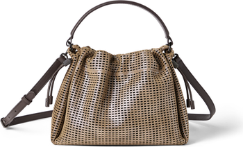 Sparkling leather is a refined material that, thanks to a sophisticated dyeing process, features a slightly metallic effect finish. The net-like structure is the result of a laser-cutting process.