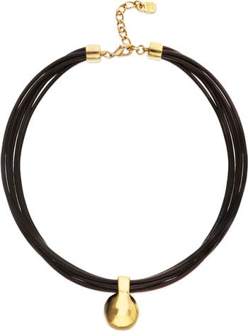 Leather necklace with large 18k gold-plated dial. Gold and leather in a union that speaks of strength and elegance. The golden sphere is your center, your gravity, your starting point.