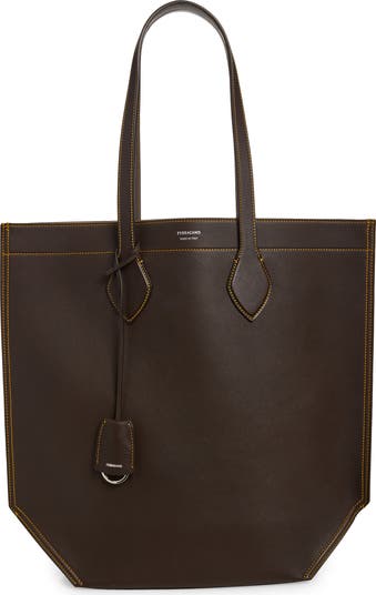 Angled sides create a geometric shape for this large, clean-lined tote crafted from supple calfskin leather elevated by contrast double stitching.