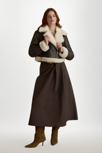- Contrasting cream shearling trim at collar, cuffs, and hem.
