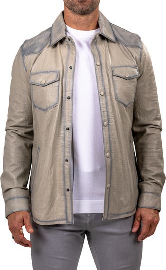 A denim effect and Western accents add extra swagger to a leather shirt jacket that will get asked about.