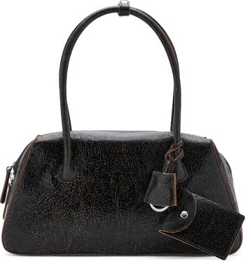 Glinting hardware and raw-edge trims highlight the distressed leather exterior of a bowling-inspired shoulder bag featuring a spacious interior and removal pouch for optimal organization.