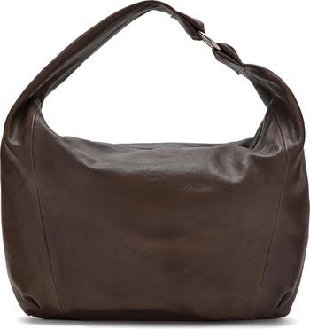 Polished hardware and burnished leather highlight the slouchy silhouette of a spacious shoulder bag suspended from a wide strap for comfortable carry.