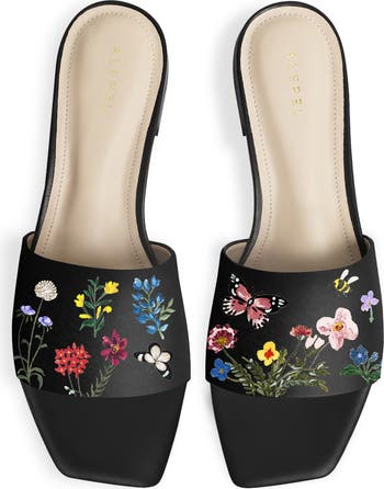- Slip on, open-toe square slide with a 1/2 inch heel