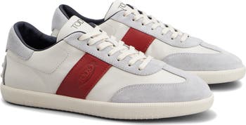 Smooth leather and velvety suede add to the sleek, fleet aesthetic of this tricolor lace-up sneaker set on a pebbled rubber cupsole.