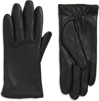 Sleek leather gloves lined with a decadently cozy cashmere-softened knit feature touchscreen-compatible fingertips to keep you connected in the cold.