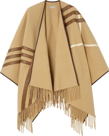 A cape crafted in Italy from soft cashmere. Panels of leather are intricately laser-cut and embroidered to form motifs referencing the Burberry Check.||Fringing at both ends