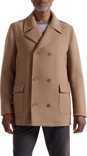 A leather back yoke reinforces both the stylishness and warmth provided by this peacoat made from a wool-blend tweed.