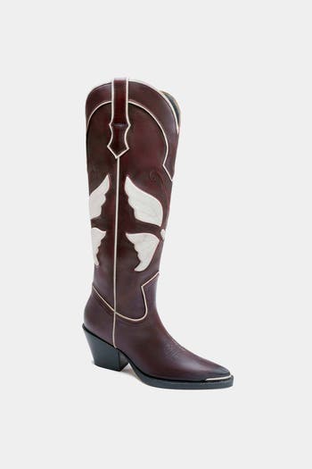 Western style high knee boots with butterfly-shaped puffed details in back and front shaft, with burgundy color embroidery, metallic toecap, hand-finished, black leather heel and sole. Dante shoes are perfect for the modern woman who demands both style and comfort in her footwear.