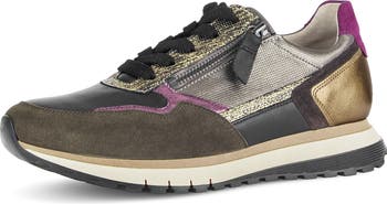 Rich leather and suede bring refined contrast to this sporty lace-up sneaker detailed with an easy side zip and grounded on a flexible sole.