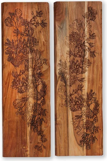 Add a touch of natural beauty to your home decor with this set of two Leaves Etched Wood Wall Art pieces. Crafted from acacia wood, these pieces feature a beautiful wood-burned leaf design. Perfect for fall decor.