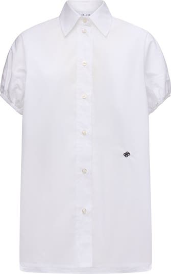 Lecce is a long, button front poplin shirt which has a relaxed fit. Small cap sleeves have a gathered hem to create a balloon silhouette. Made from a light weight Italian poplin. Made in Italy
