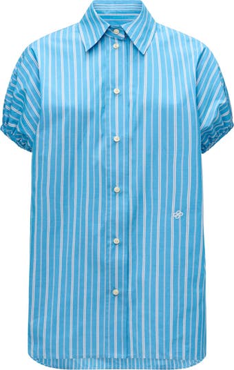 Lecce is a long, button front poplin shirt which has a relaxed fit. Small cap sleeves have a gathered hem to create a balloon silhouette. Made from a light weight Italian poplin. Made in Italy