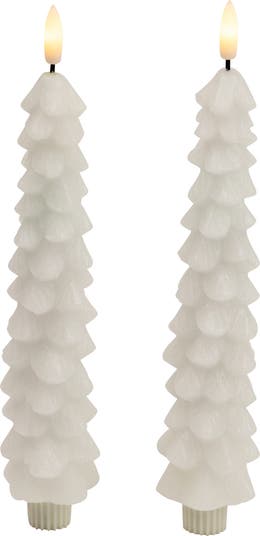 Set of 2 tapered Christmas candles feature a textured white tree design crafted from real wax for a timeless holiday look. These flameless candles emit a warm white flickering glow using LED candles, creating a cozy atmosphere without the mess of traditional flames. Each candle is battery operated with a on/off button and battery access at the bottom. Perfect as LED Christmas candles or battery operated Christmas candles for mantels, windowsills, or centerpieces. Product Features: Set of 2 Made with real wax Lighted with warm white flickering LED lights Convenient on/off button Battery access at the bottom of each candle Each candle requires 2 AAA batteries - not included Recommended for indoor decorative use only Overall Dimensions: 9.75" high x .75" diameter Candle: 8.5" high Flicker flame tip: 1.25" high Materials: wax/plastic