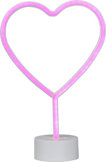 Send a warm pink glow throughout your favorite space with this 11.5” heart light. The vibrant pink LED neon light features super bright neon-style lighting with an on-off switch in the detachable base. Use this heart lamp for Valentine’s Day, a child or teen’s room, dorm room or anywhere you want to show a sign of your love. Requires three AA batteries, not included. Product Features: Color: pink rope lights One-sided design LED lights use up to 90% less energy Stays cool to the touch Requires 3 AA batteries - not included Comes with detachable base for easy storage Convenient on/off switch at the bottom UL certified and approved for indoor use Dimensions: 11.5"H x 7.75"W x 3.25"D Material(s): plastic/silicone