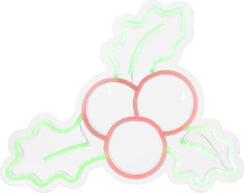 Add a little “holly jolly” glow to your holiday décor! This 12” Christmas holly light blends classic charm with a modern aesthetic, featuring vibrant red and green LED rope lights that mimic the look of a vintage neon sign. Perfect as a festive window display or an eye-catching wall decoration, the clear plastic frame gives this Christmas light a clean, polished look from every angle. Long-lasting and cool to the touch, the energy-efficient LED lights keep things merry and bright all season long. Whether hung in a window or mounted on a wall, it’s a standout piece that brightens your space with seasonal style and a splash of holiday color. Product Features: Color: LED red and green rope lights One-sided design 6' lead cord Product Features: LED lights use 90% less energy Bulbs stay cool to the touch UL certified and approved for indoor use only Cannot be connected together with other lighted items Comes ready to hang with keyhole hangers Hanging hardware not included Class 2 power supply Powered by USB - power plug included Input: 100-240 volts, 50/60 hertz, .35 amps Output: 5 volts, 1 amps Dimensions: 12"H x 14"W x .75"D Material(s): PVC/wire/metal