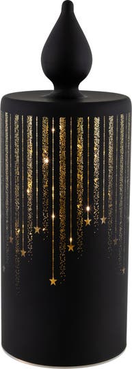 Transform your holiday decor into a mesmerizing spectacle with our glass tabletop Christmas candle decoration. Illuminated by LED lights, this enchanting centerpiece features a captivating rainfall design with star accents, casting a warm and inviting glow that instantly infuses any space with holiday cheer. Elevate your seasonal atmosphere with this stunning accent piece, perfect for adding a touch of magic to your celebrations. Product Features: Glass Christmas candle decoration Matte black with gold shooting stars Pre lit with warm white micro fairy LED lights On/Off switch located on the bottom Requires 3 AA batteries; not included For indoor use only Dimensions: 9.5" high x 3.5" diameter Material(s): glass/plastic/metal