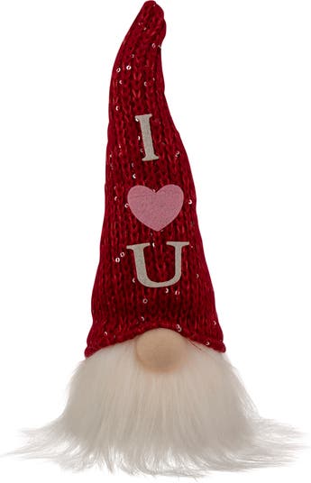 This adorable gnome is donned in a heartwarming knitted hat, designed with the letters and symbol "I heart U" with a pink heart, making it the perfect expression of love. A warm soft glow is emitted by a gentle LED light creating a cozy ambiance that's sure to melt hearts. Whether as a thoughtful gift for a special someone or a delightful addition to your Valentine's Day decor, this lovable gnome is bound to bring joy and affection to your celebrations. Product Features: LED Lighted Valentine's Day gnome figure Red hat reads 'I heart U' accented with a pink heart Hat is accented with silver sequins Weighted bottom for stability Requires (3) LR44 batteries - included For indoor use only Dimensions: 11.5" high x 4" diameter Material(s): fabric/faux fur/felt/plastic/sequin